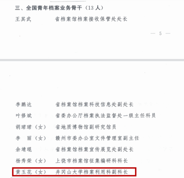 近日,江西省档案局印发《江西省入选国家档案局“三支人才队伍”人选名单》、《省级“三支人才队伍”入选名单》,我校档案馆黄玉花同志成功入选全国和全省青年档案业务骨干。